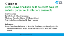 ATELIER B Créer un avenir à l'abri de la pauvreté pour les enfants: parents et institutions ensemble Intervenantes: Camille Jacot, éducatrice sociale Marianne Rossel, militante ATD Quart Monde Andréa Saffore, militante ATD Quart Monde Animation:…