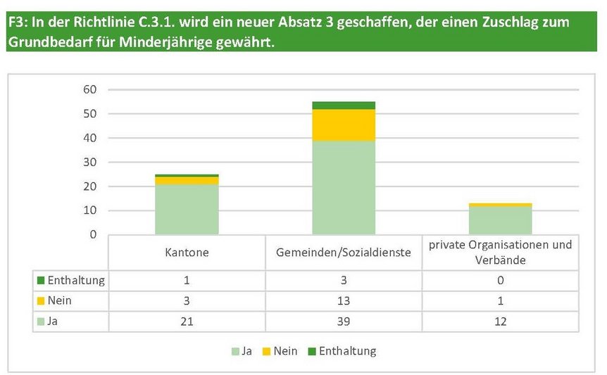 21 Kantone (84% der teilnehmenden Kantone) und 39 Gemeinden befürworteten die Einführung eines Zuschlags zum Grundbedarf für Minderjährige. Drei Kantone und 13 Gemeinden lehnten diesen ab, ein Kanton und drei Gemeinden enthielten sich der Stimme. Eine klare Mehrheit begrüsst den Vorschlag, weil mit diesem Zuschlag die soziale Teilhabe von Kindern und Jugendlichen gefördert wird. Die ablehnende Minderheit befürchtet, dass nicht sichergestellt werden kann, dass der Zuschlag tatsächlich bei den Kindern und Jugendlichen ankommt. Bedarfsorientierte situationsbedingte Leistungen werden von ihnen daher bevorzugt. Auch zustimmende Kantone sehen darin eine Herausforderung und betonen, dass die Bedeutung des Zuschlags gut kommuniziert werden müsse. Viele Sozialdienste halten aber auch fest, dass gerade armutsbetroffene Eltern oft ihre eigenen Bedürfnisse zugunsten ihrer Kinder zurückstellten. Angesprochen wird auch der problematische und geschichtlich belegte Generalverdacht der mangelnden Fürsorge von armutsbetroffenen Eltern und Minderheiten für die eigenen Kinder. Diesen Generalverdacht gilt es kritisch zu hinterfragen angesichts der grossen Ungerechtigkeiten, die dadurch in der Vergangenheit geschahen. Um den geäusserten Bedenken Rechnung zu tragen, wurden zwei Anpassungen am Revisionsentwurf vorgenommen. Diese stellen klar, dass der Zuschlag für die Bedürfnisse der Kinder zu verwenden ist.